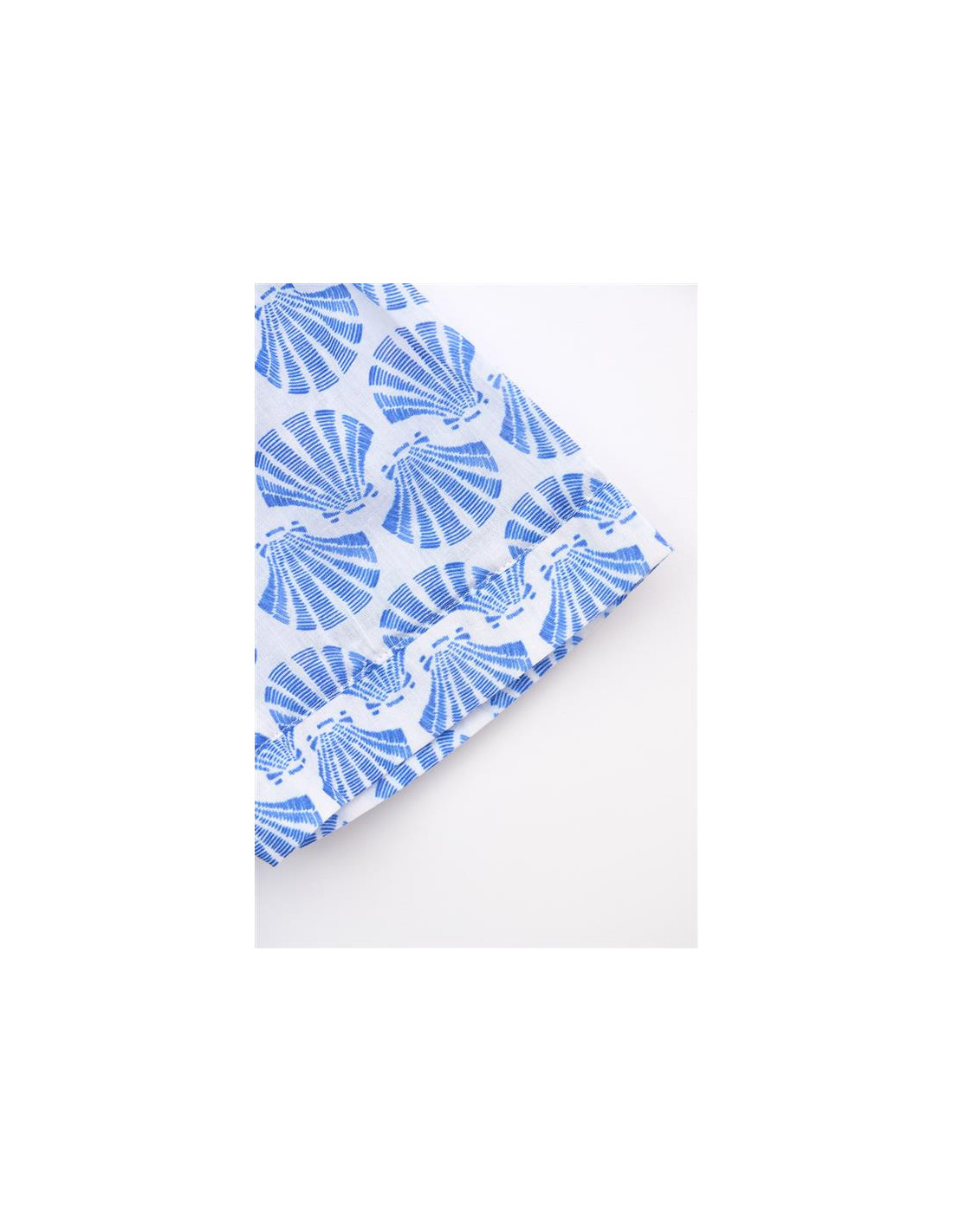Blusa o camisa para mujer con estampado de conchas confeccionada en tejido de algodón muy ligero. Esta blusa tiene escote en pico con dos cordones azules.