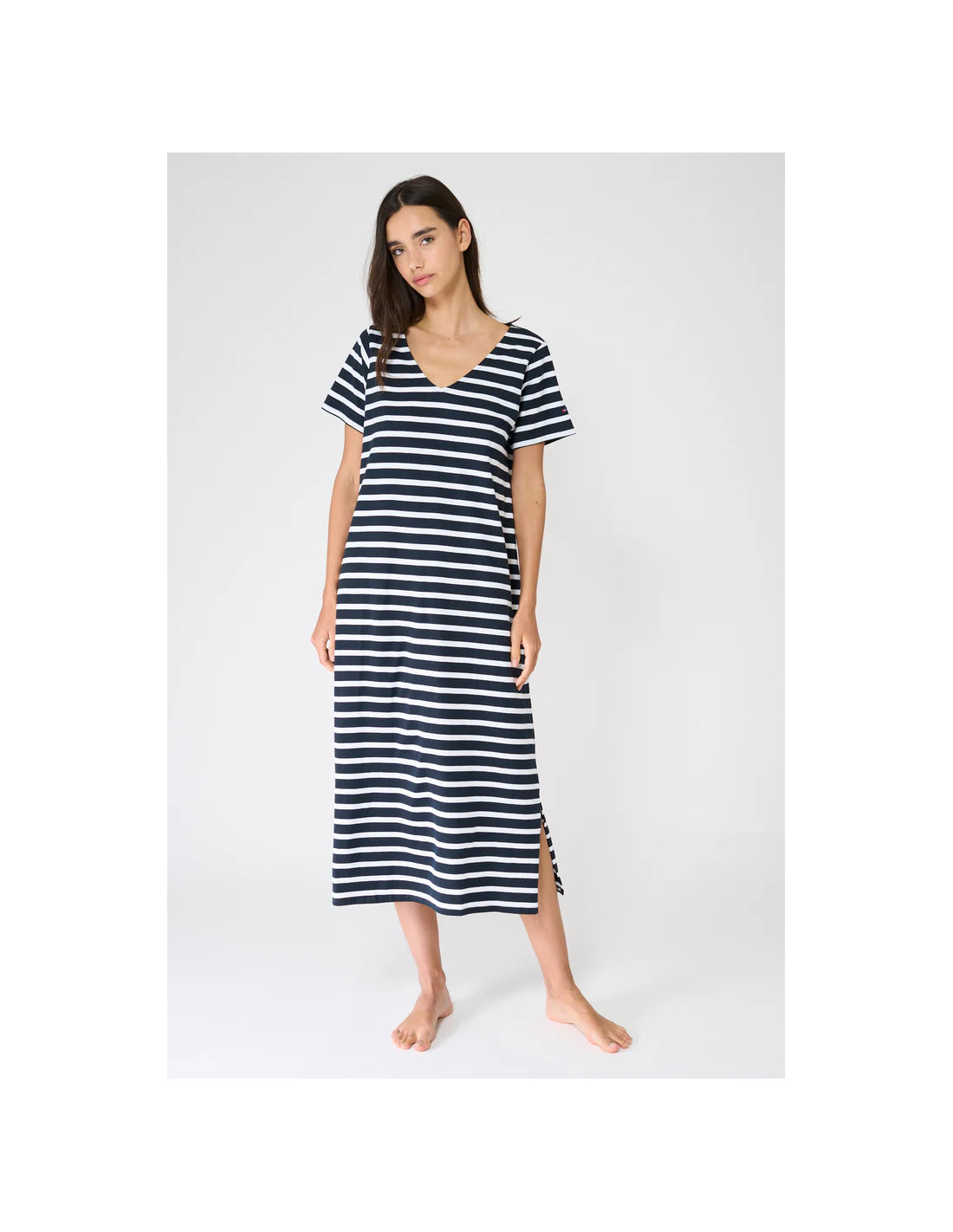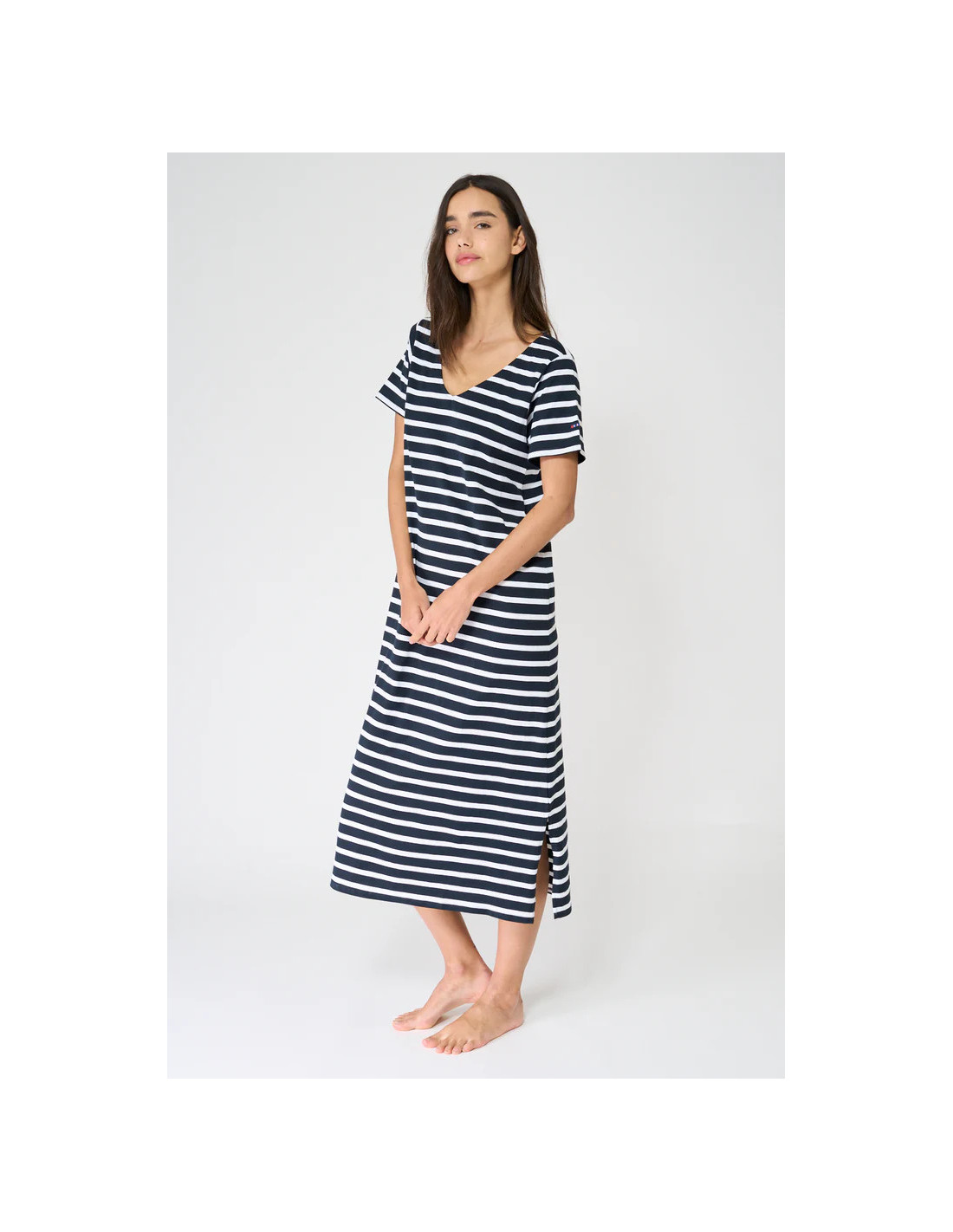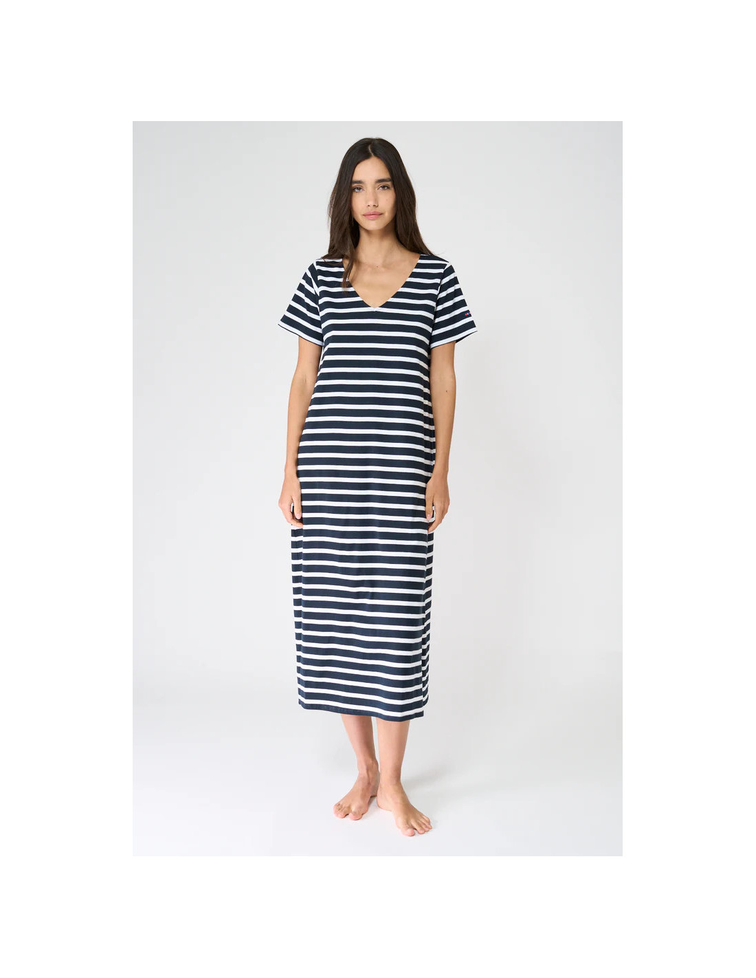 Vestido camiseta largo de algodón con rayas y escote en V, donde el clásico estampado marinero se adapta a una silueta suelta y actual.