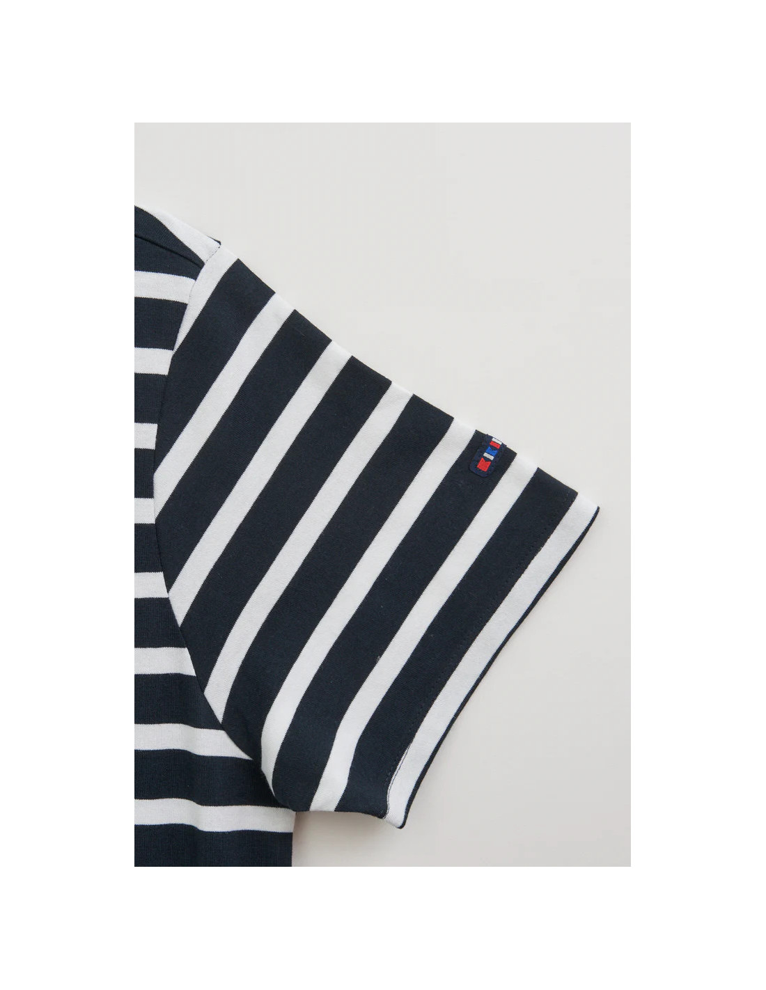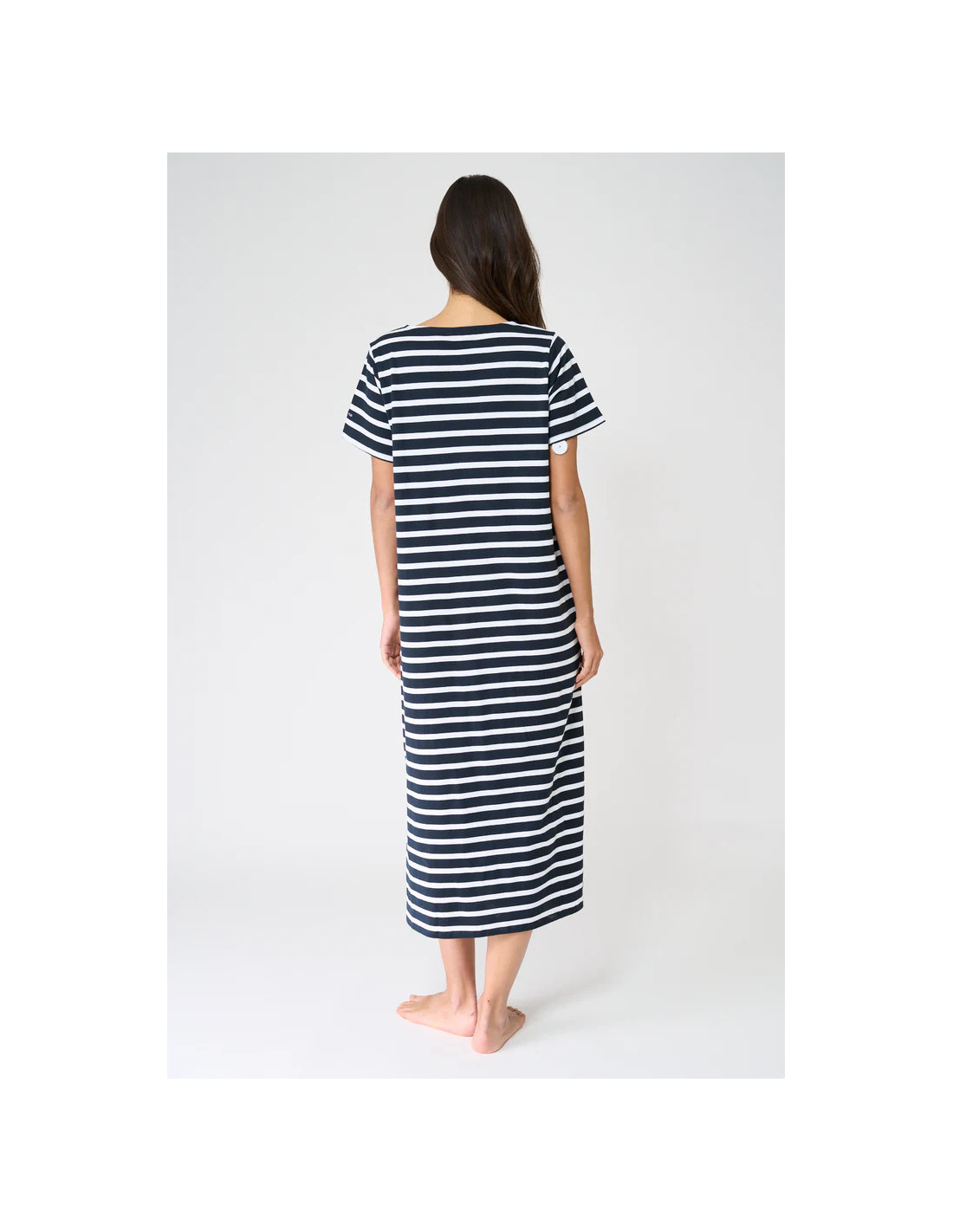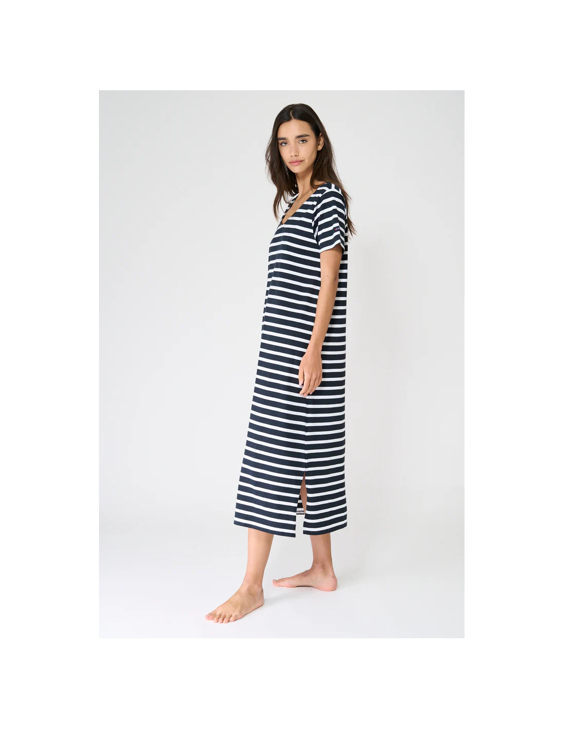 Vestido camiseta largo de algodón con rayas y escote en V, donde el clásico estampado marinero se adapta a una silueta suelta y actual.